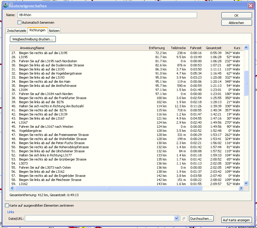 Habe ich die Route auf die o. g. Weise festgelegt, so erfolgt die Übertragung in das GPS-Gerät mit anschließender Kontrolle der Ortsdurchfahrten (je nach gewählter Einstellung ist der berechnete Weg schon manchmal etwas seltsam).